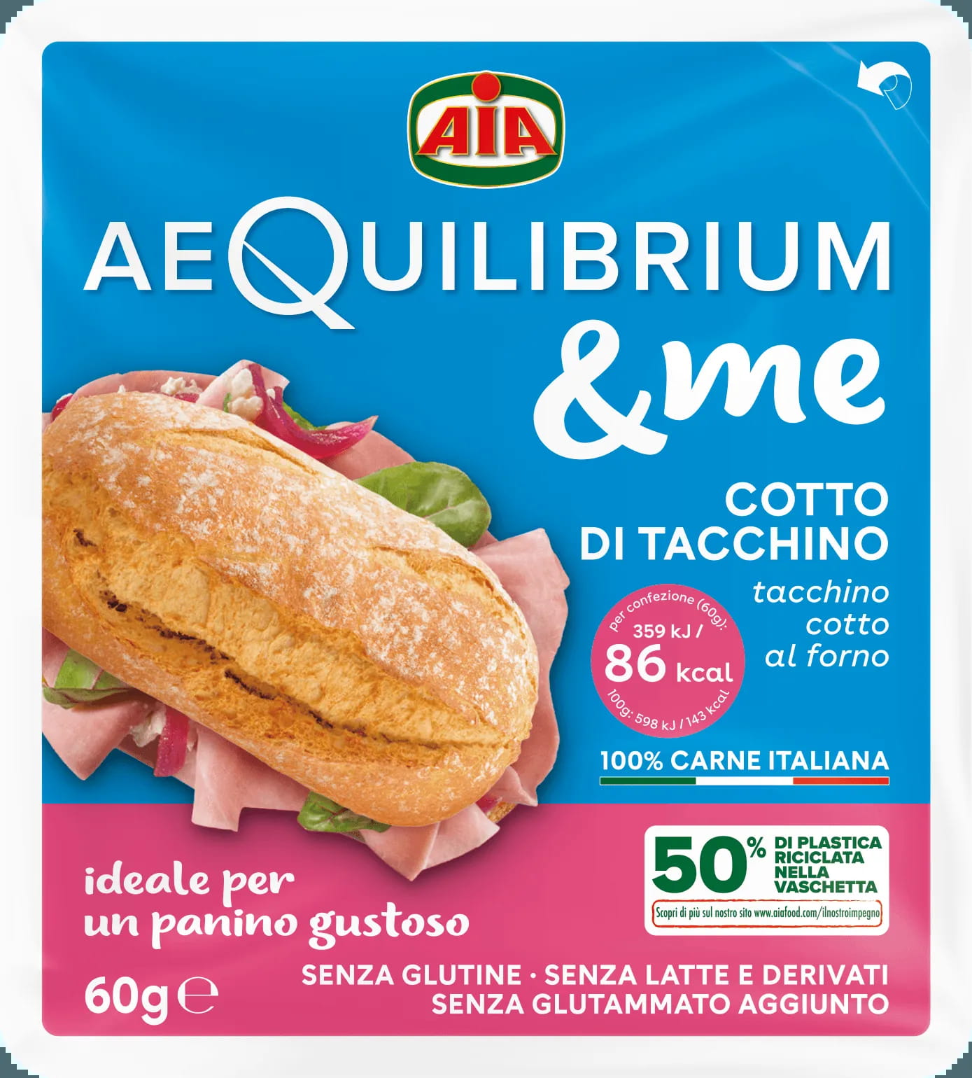 AIA AeQuilibrium&Me Gekochter Pute aus 100% italienischem Fleisch ist in einer praktischen 60-Gramm-Packung "just for you" erhältlich: ideal, um sich tagsüber einen Moment Zeit für sich selbst zu nehmen und jede Mahlzeit mit Einfachheit und Geschmack zu bereichern.