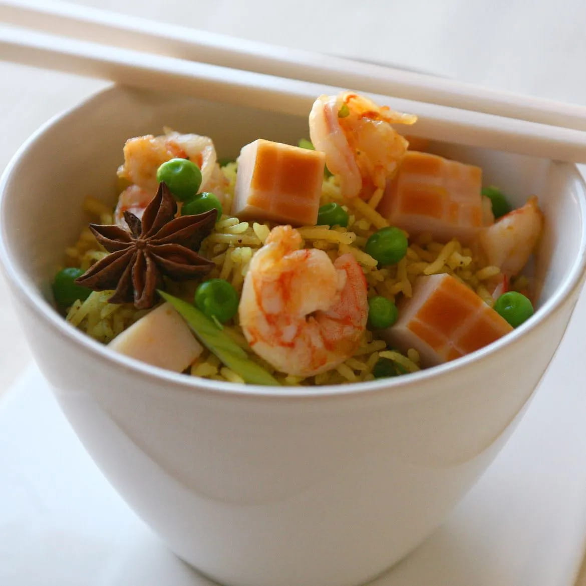 - Hühnchen und Garnelen Curry mit Basmati-Reis