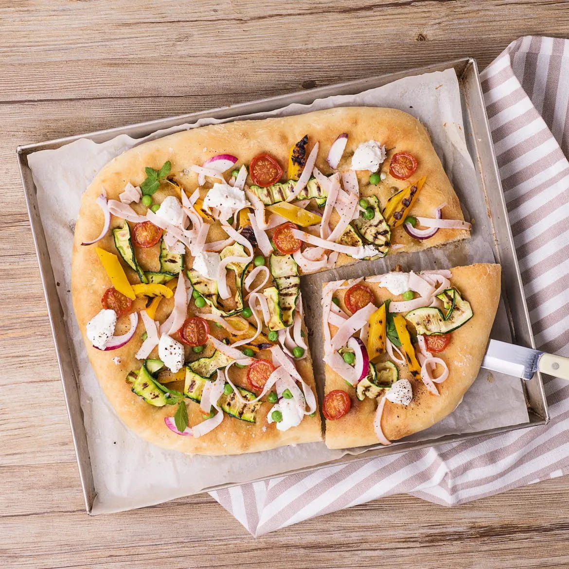 Hier ist das köstliche Rezept für die knusprige Focaccia mit Streifen von aeQuilibrium und süßem Paprika, gegrilltem Gemüse, Tomaten, roten Zwiebelringen, Erbsen und Minze!