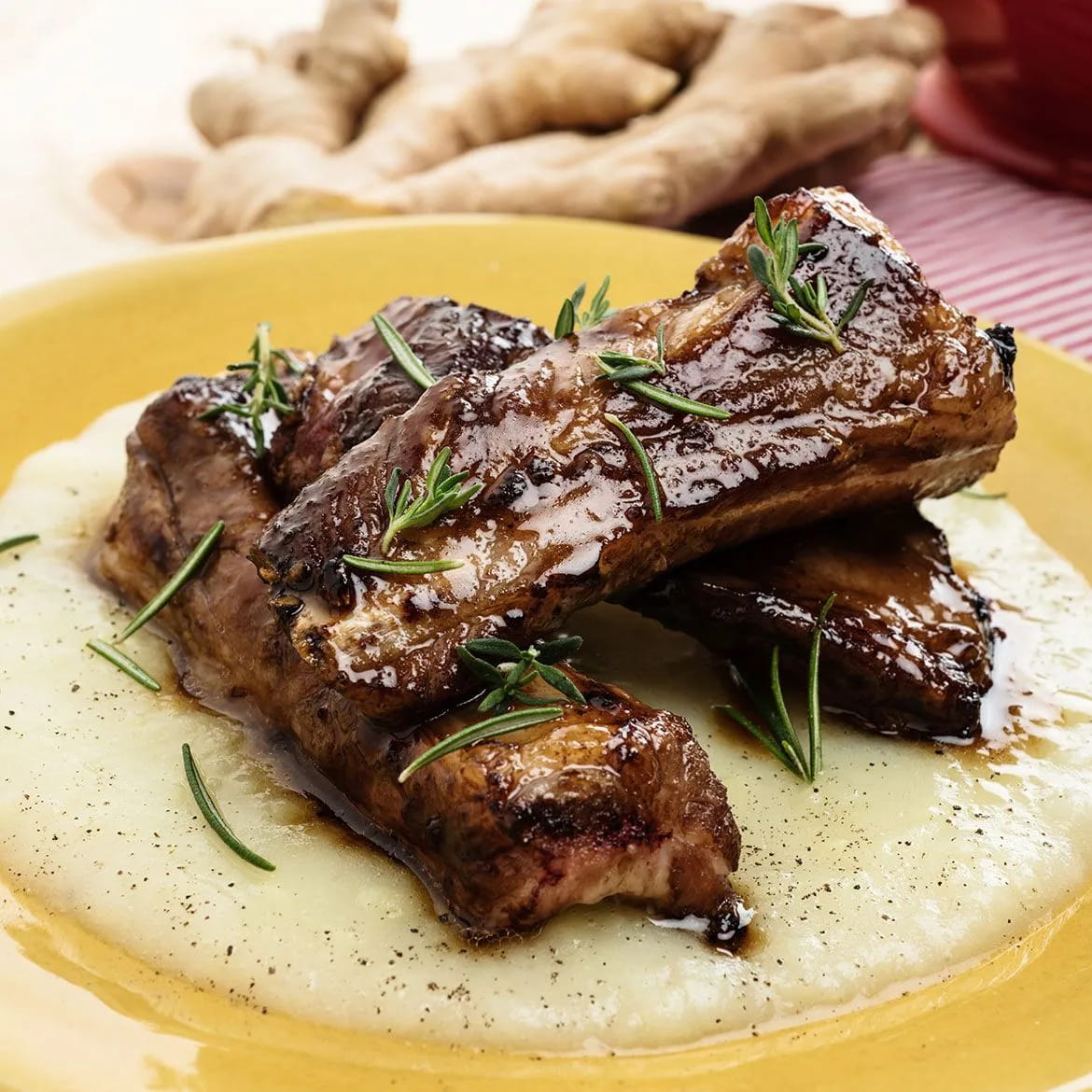 - Rippchen mit aromatischen Kräutern auf Ingwer-Kartoffelcreme