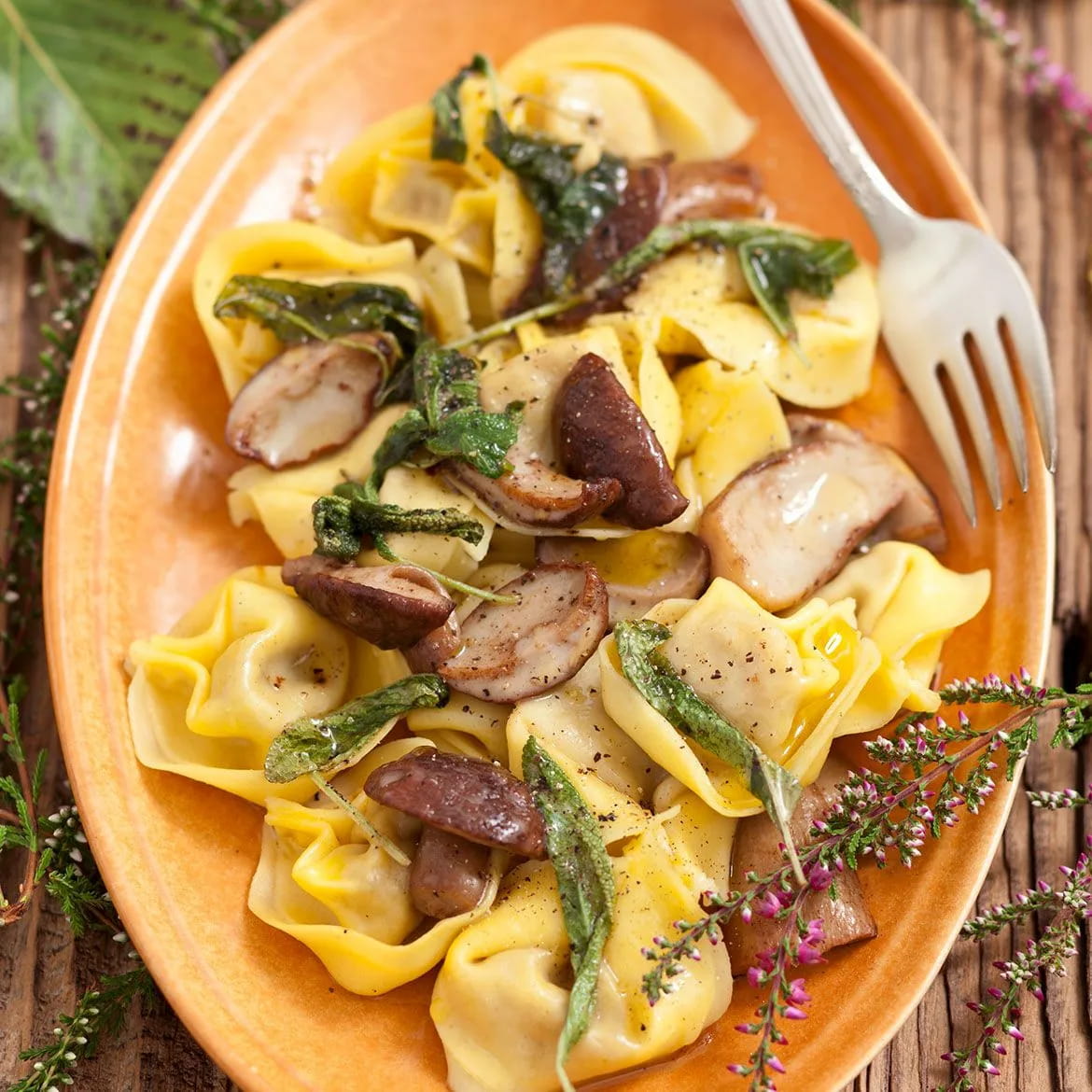 Kombinieren Sie die Tortelloni gefüllt mit Kaninchen und Kartoffeln mit Steinpilzen und Salbei mit einem Glas Rotwein... eine wirklich gewinnende Kombination!
