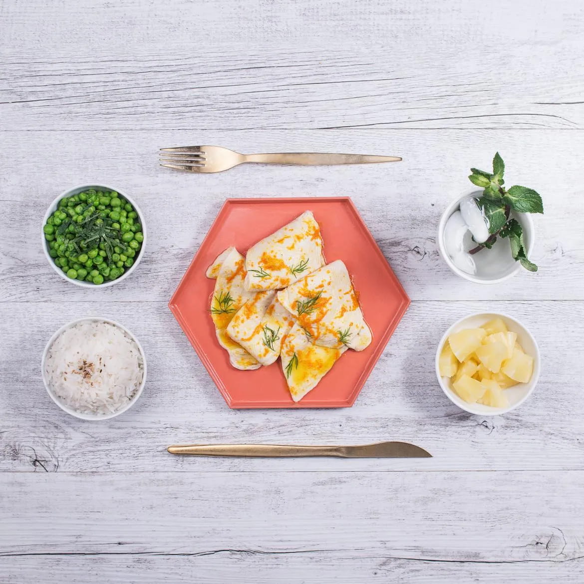 Hier ist das leckere Rezept für Zitronen- und Orangenschnitzel mit Dill, Basmatireis, Minzerbsen, Ananas und Minzwasser!