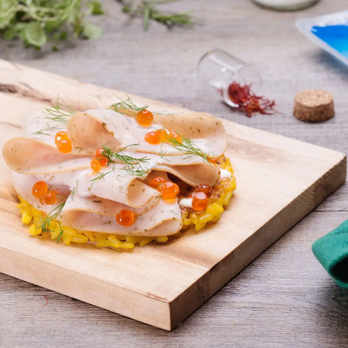 This recipe combines Italian culinary culture with that of Northern European countries. The rice cake is crispy and contrasts the softness of the aeQuilibrium AIA Herb Turkey Breast, while the salmon roe gives the dish a savory taste, which is well balanced by the sour cream.