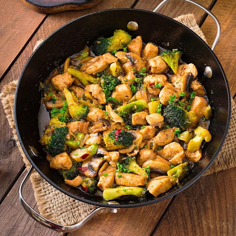 Scaldare 2 cucchiai di olio in una padella antiaderente e saltare la tagliata di pollo per 5 minuti a fiamma viva. Servire poi con verdure fresche di stagione.