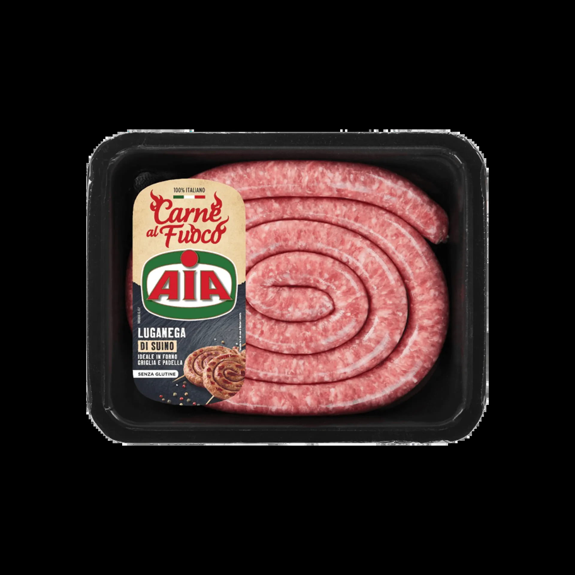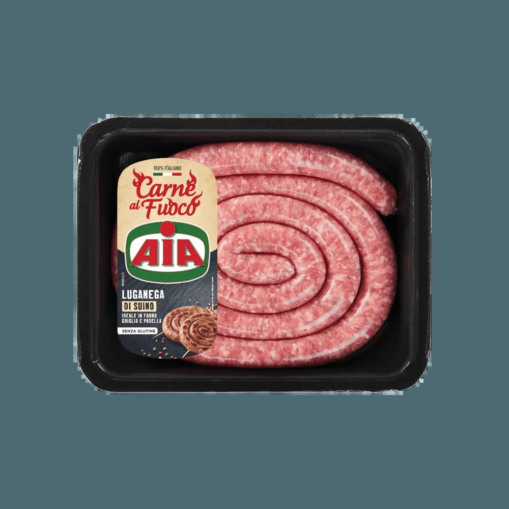Salsiccia in formato luganega, arrotolata nel suo pratico vassoio.