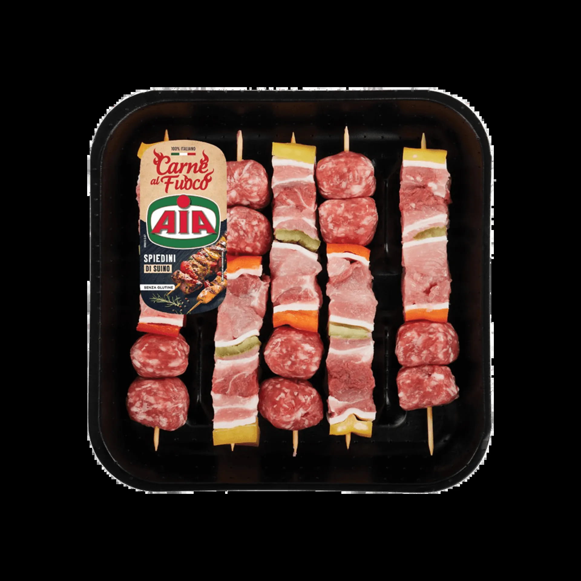 Spiedini costituiti da tagli teneri di suino, separati da peperoni e sfoglie di pancetta, accompagnati all'estremità da due chicchi di salsiccia.