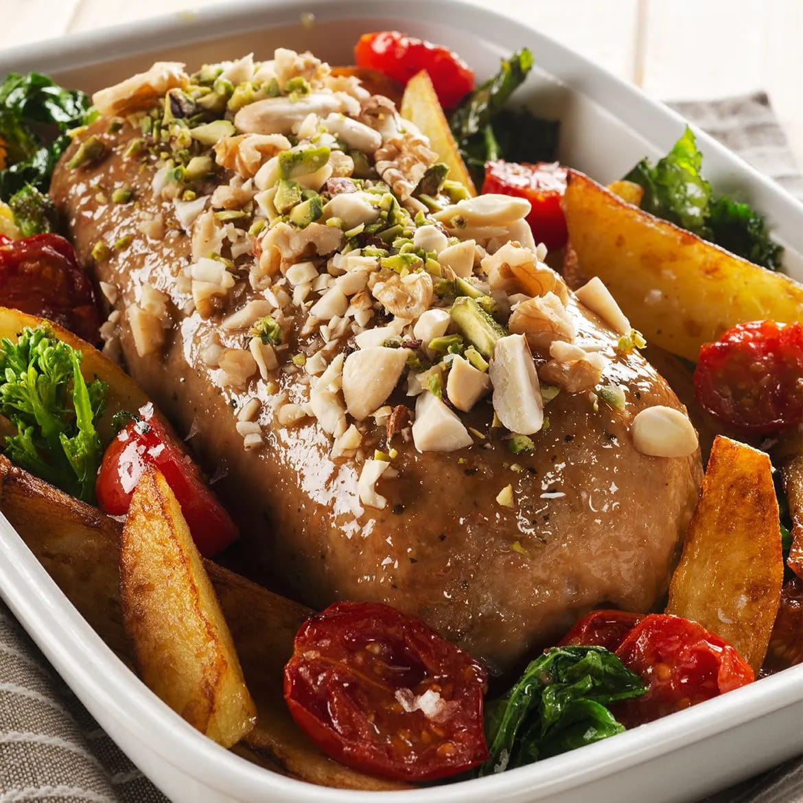 Il BonRoll AIA, si sa, accontenta sempre tutti a tavola e creare sempre nuovi abbinamenti non è solo divertente, ma vi permette di portare in tavola in pochissimo tempo secondi piatti gustosi e semplicissimi da realizzare. Oggi vi proponiamo una ricetta dal tocco gourmet e coloratissima: il BonRoll in granella di frutta secca con verdure al forno. Questo secondo piatto completo e gustosissimo è perfetto per essere servito in occasione di un pranzo della domenica o una cena tra amici, meglio se accompagnato da un calice di buon vino rosso.