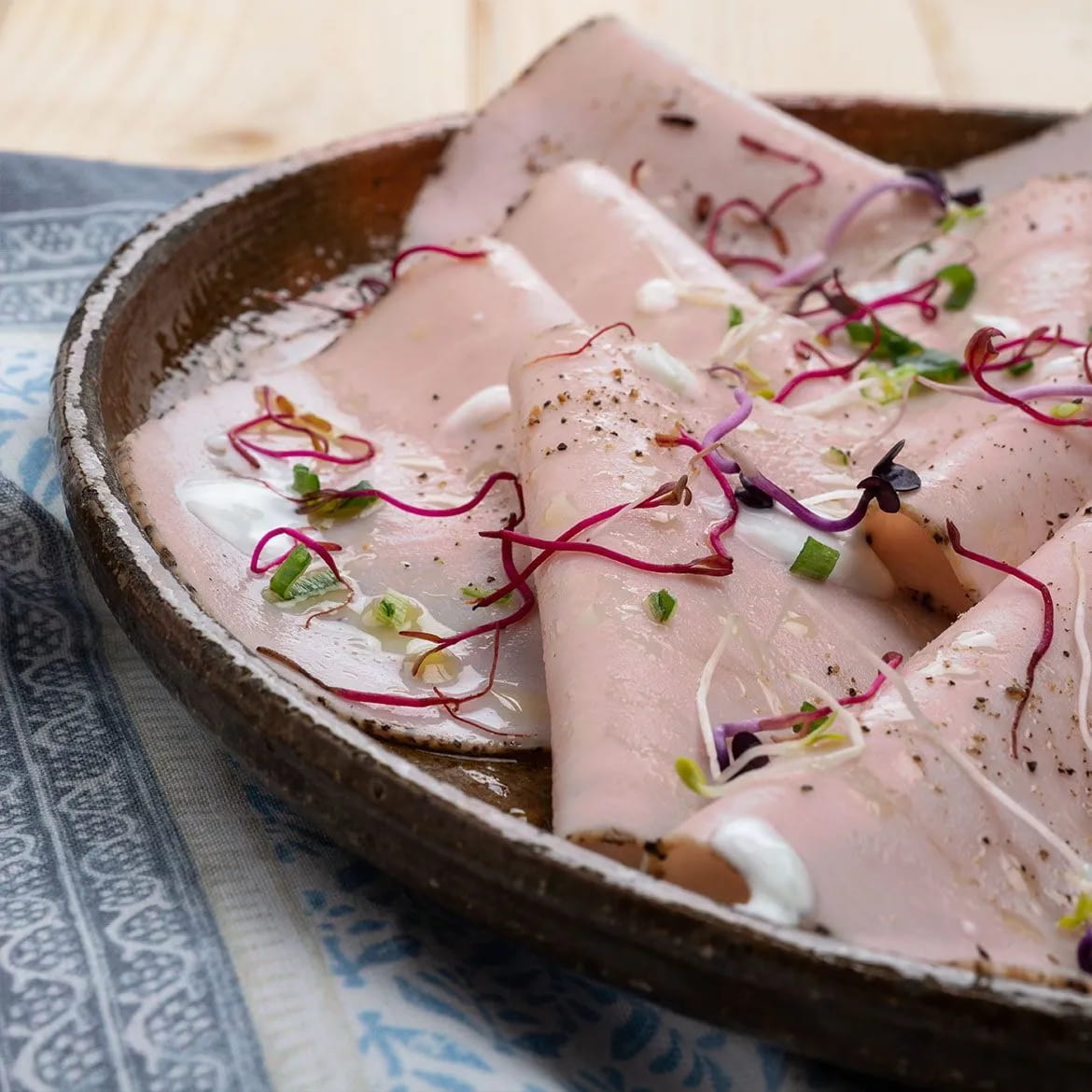 Il carpaccio di aeQuilibrium con salsa yogurt e germogli sarà un piatto bello da vedere e buono da mangiare che potrà essere messo anche nella schiscetta del pranzo.