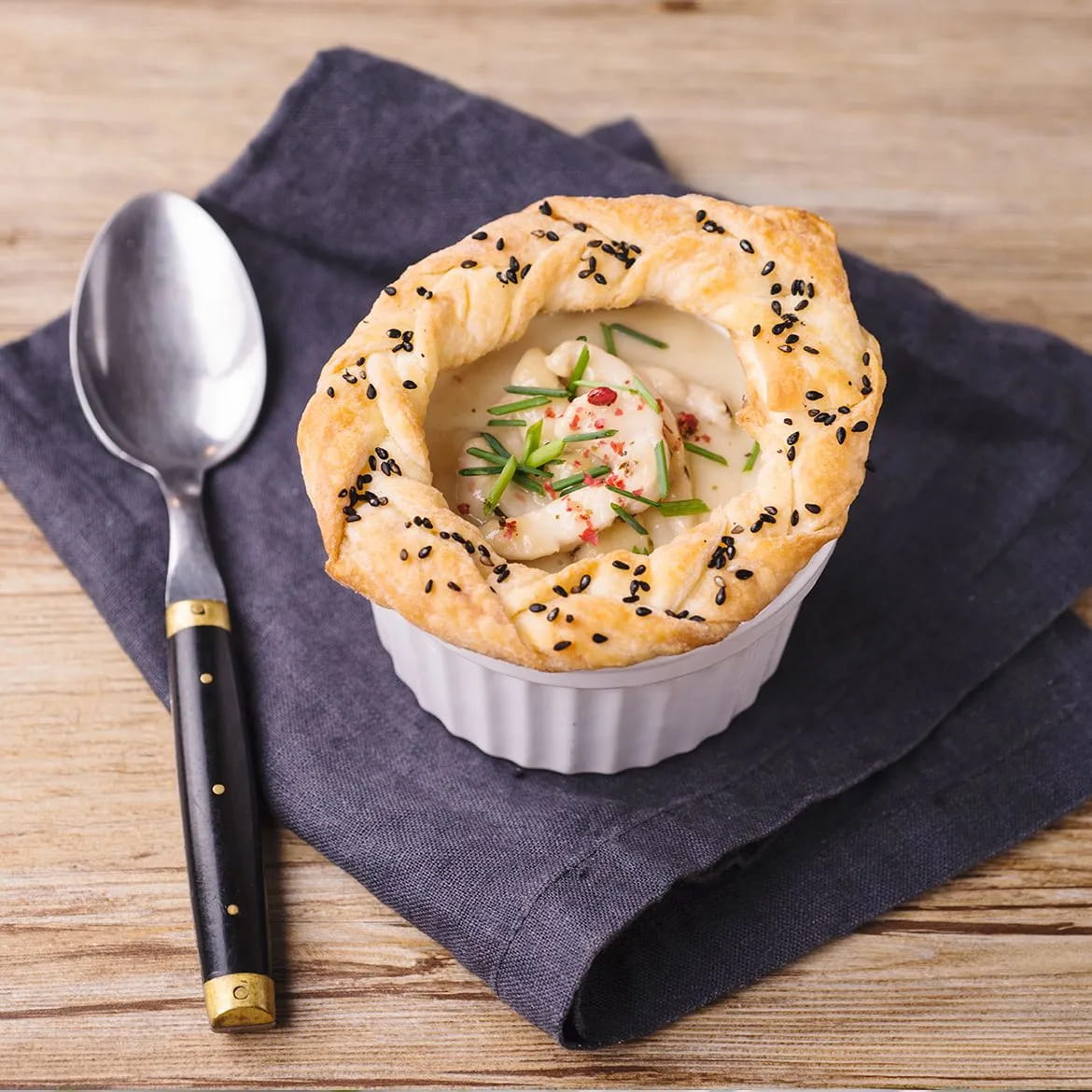 Infornate la cocotte a 170°C per 10 minuti fino a quando la pasta sfoglia non sarà croccante e ambrata. Sfornate la cocotte e decorate con erba cipollina, pepe nero macinato fresco e scagliette di Parmigiano.