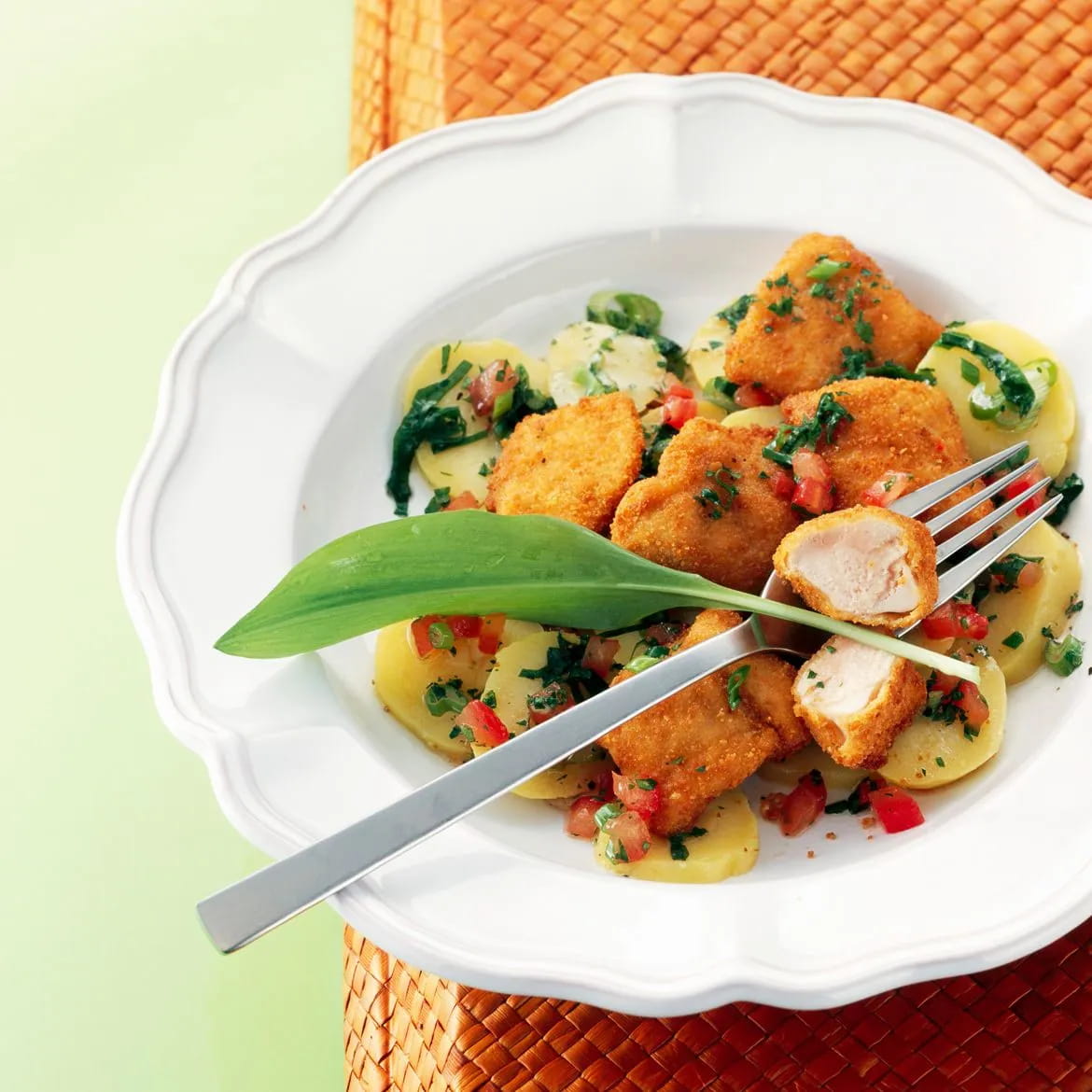 In questa ricetta vi consigliamo di abbinare i bocconcini di pollo fritti ad un mix leggero di lattuga, pomodorini, funghi champignon e origano.