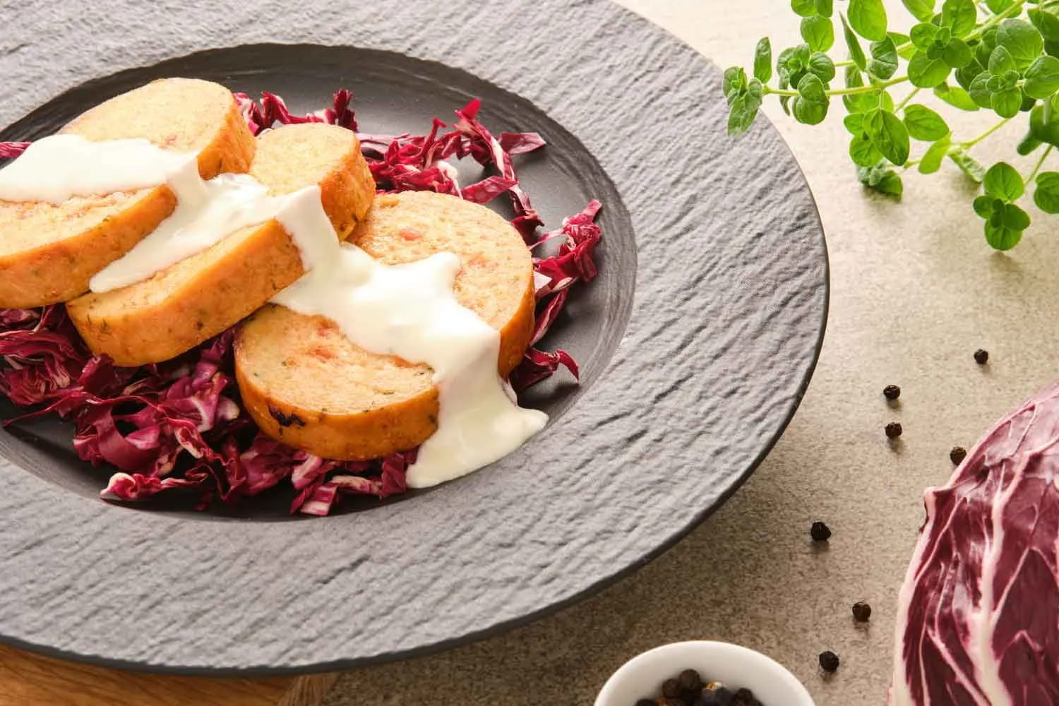 Una volta che il BonRoll sarà cotto tagliatelo a fette e servitelo irrorandolo con la salsa gorgonzola e accompagnato con il radicchio.