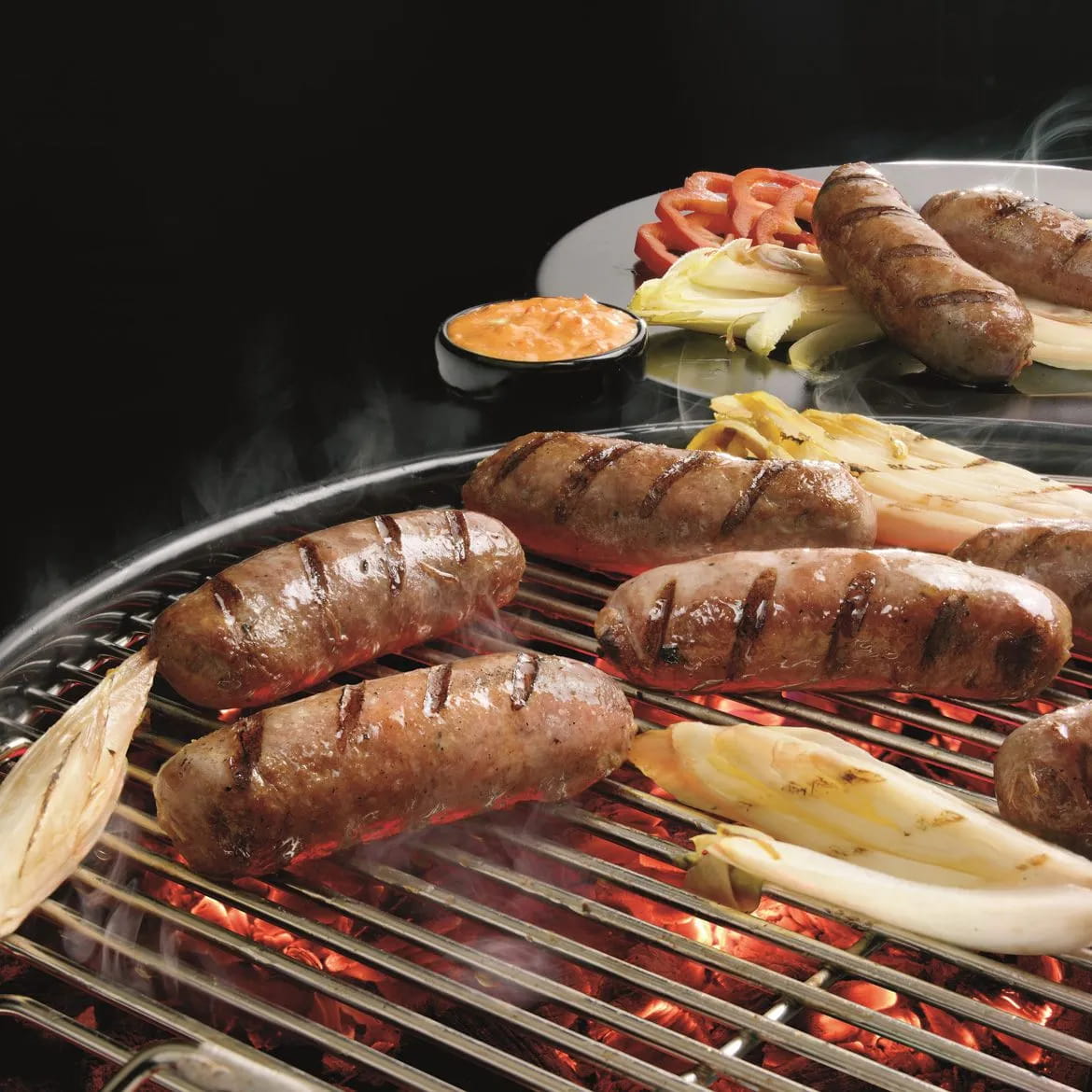 Lasciate raffreddare la marmellata di peperone piccante. Tagliate l'indivia in 4 parti e conditela con olio extravergine di oliva, sale e pepe e cuocetela sul barbecue insieme alle salsicce.