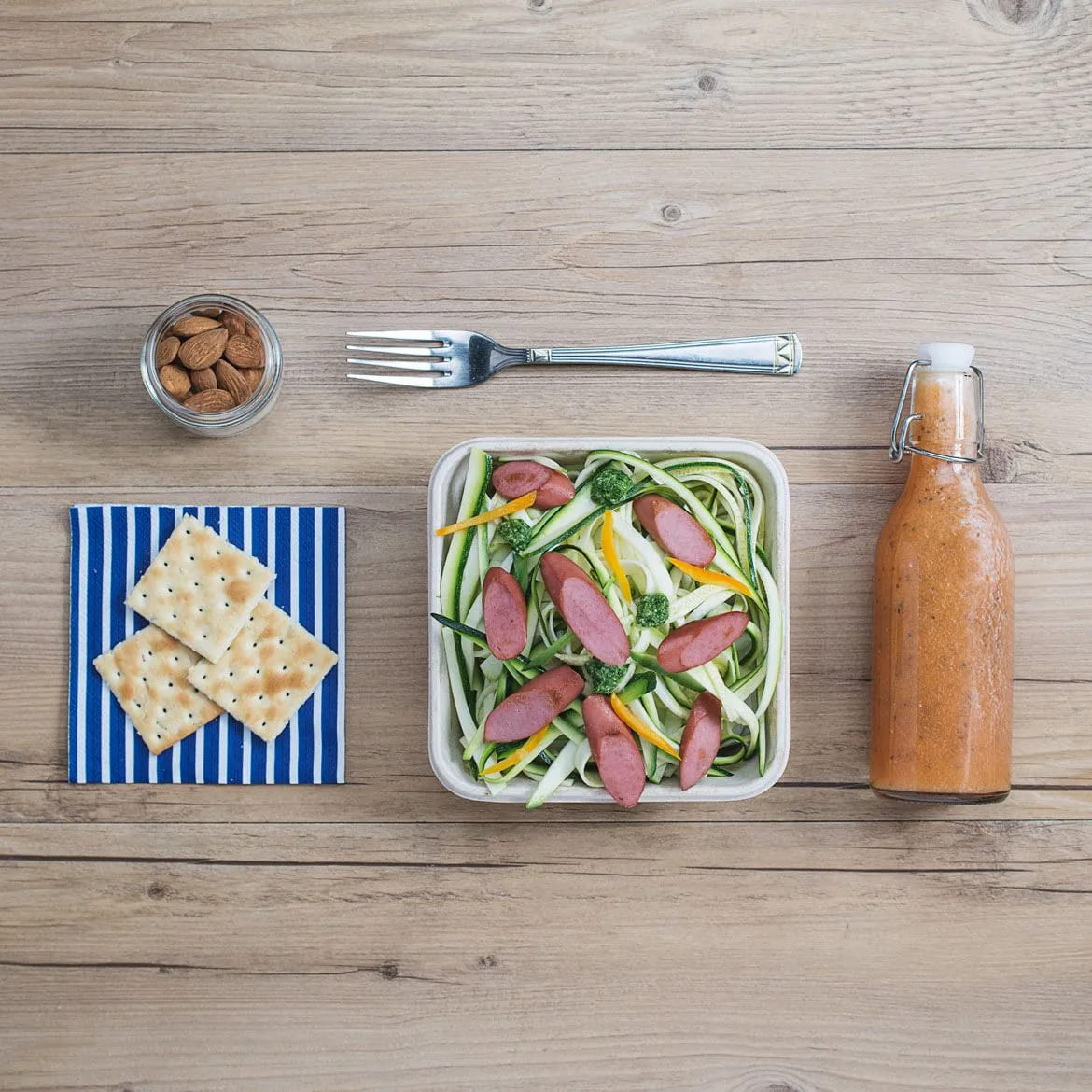Ecco la ricetta della schiscetta con tagliatelle di zucchine con pesto di rucola, Wudy e peperoni gialli, centrifugato di frutta, mandorle secche e crackers!