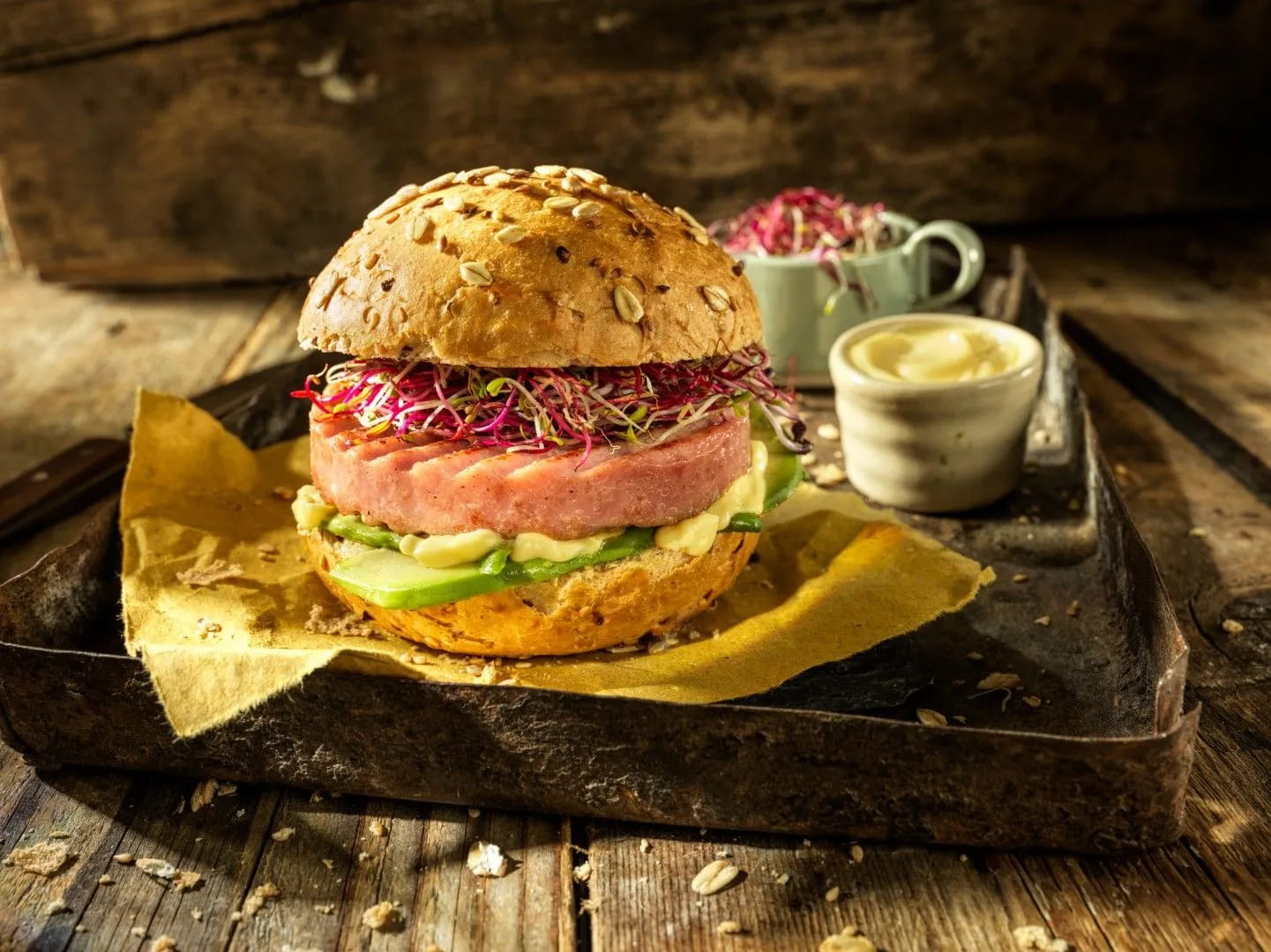 Assembla il panino: spalma la maionese al lime sulla base del panino, aggiungi il burger caldo, qualche fettina di avocado e i germogli misti. Chiudi con l’altra metà del panino.